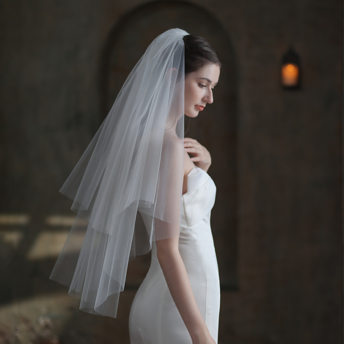 米色复古婚礼旅拍道具领证新款 出门纱 高透双层简约新娘头纱 V841由