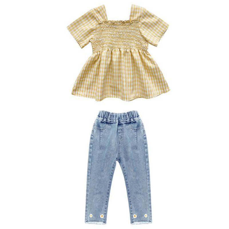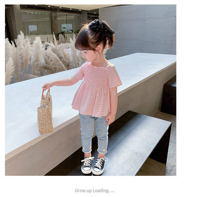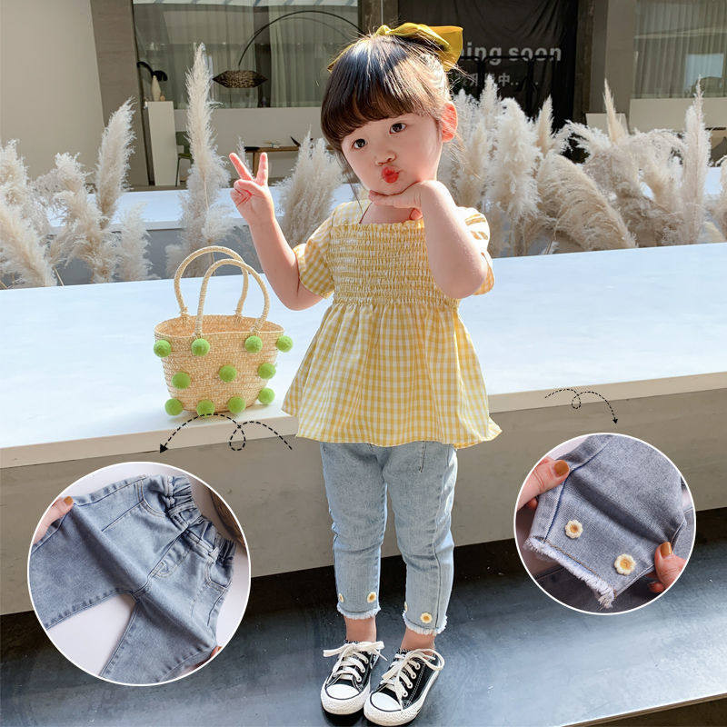 2洋气3女宝宝4韩版 女童牛仔裤 套装 夏季 两件套潮 5格子6时髦7岁衬衫