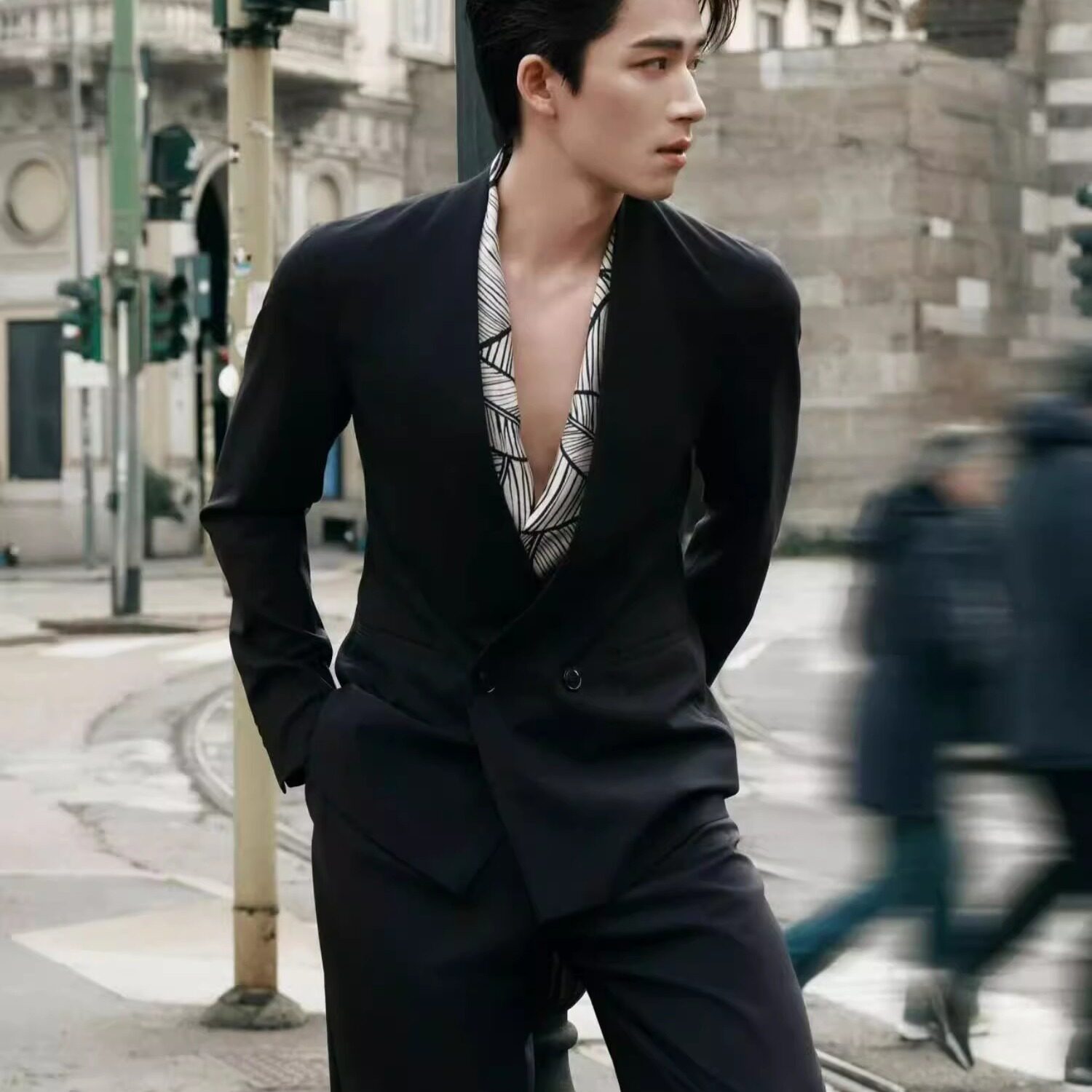 明星王星越同款 男潮流韩版 雅痞高级感百搭休时尚 潮 黑色双领口西装