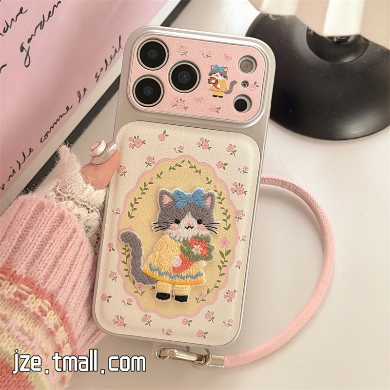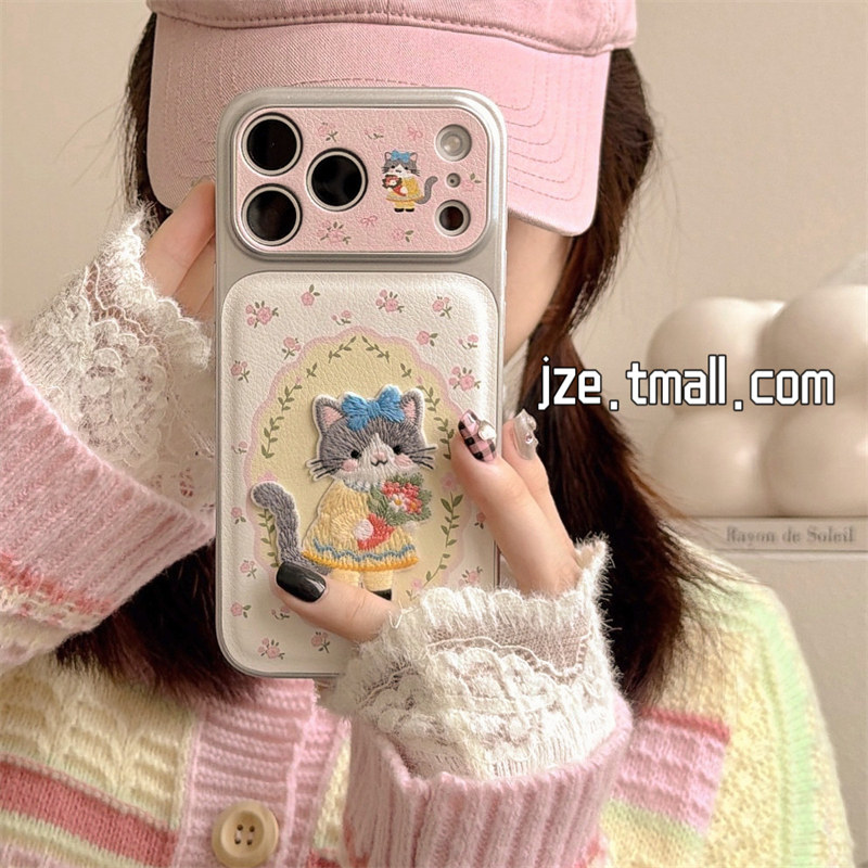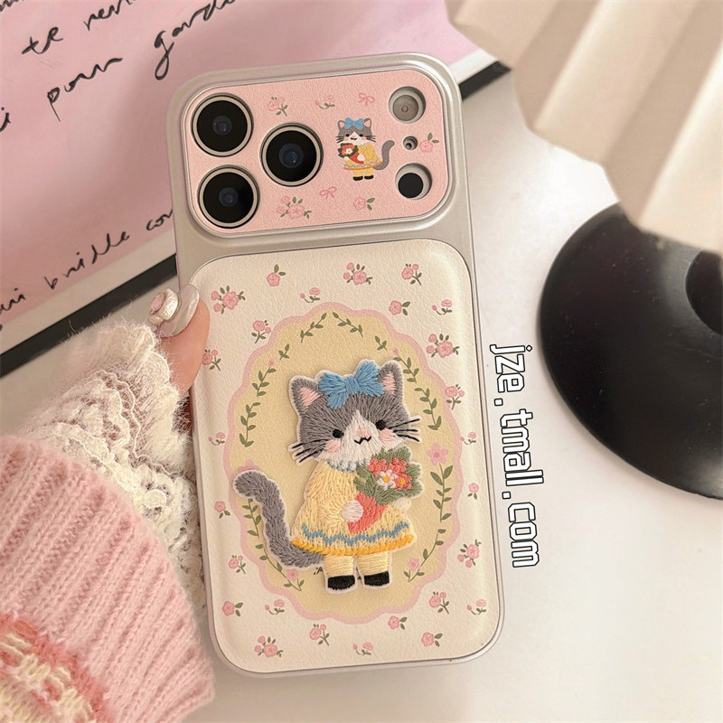 16pro少女17pro全包大视窗14防摔手机套 jze早春ins可爱碎花猫咪刺绣适用苹果17ProMax手机壳皮质iphone15新款