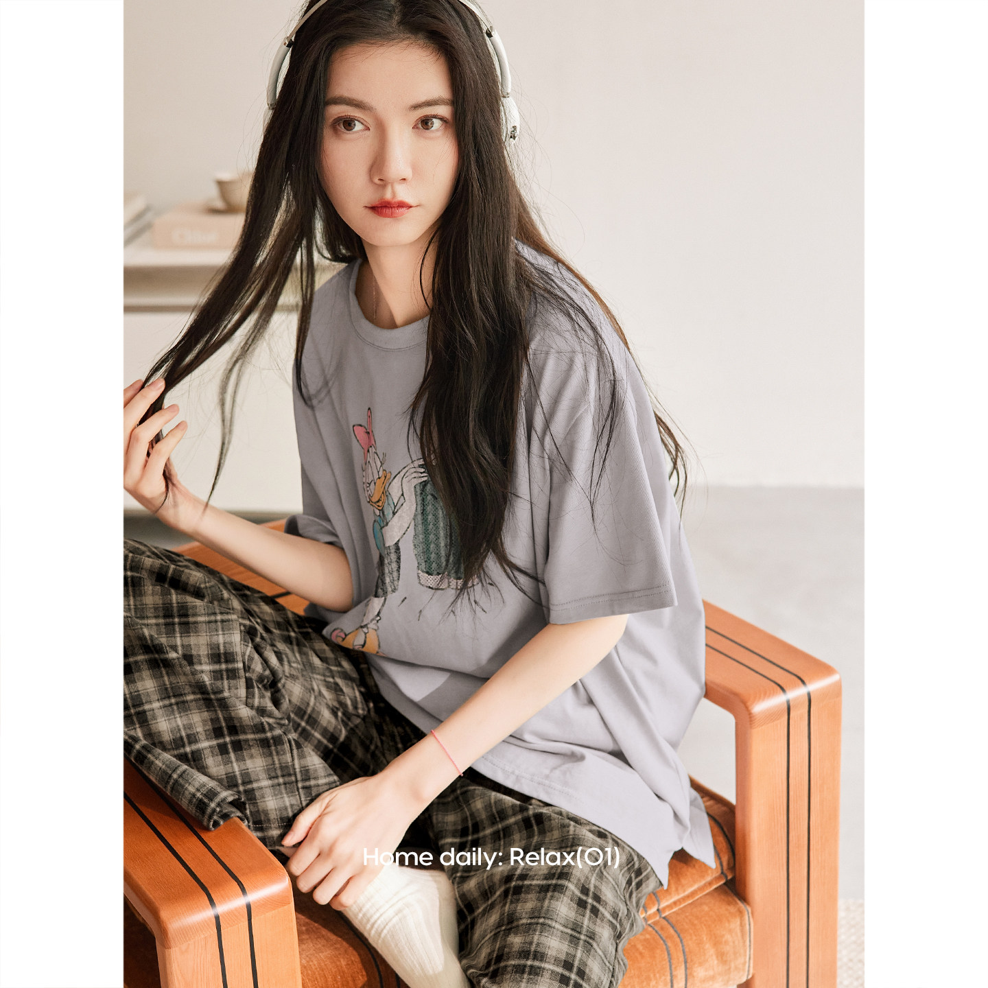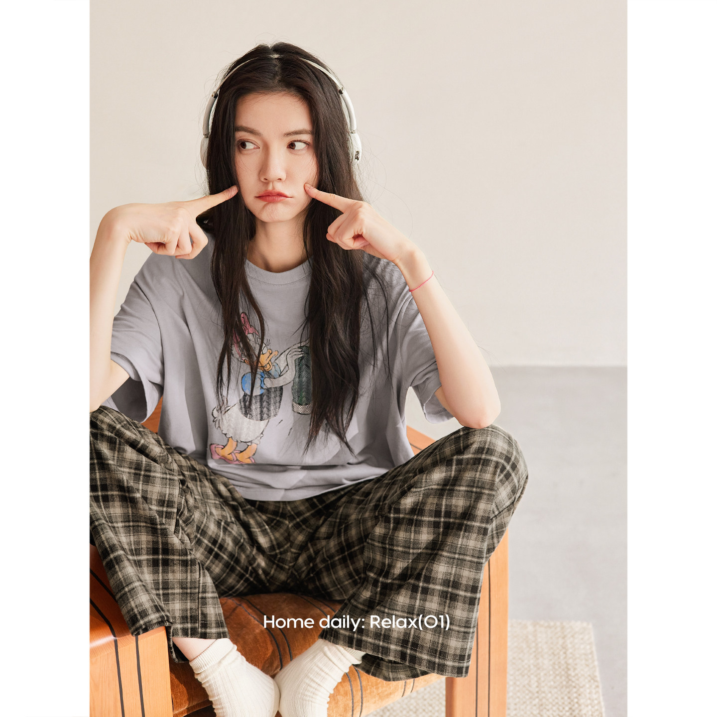 格子长裤 凉感睡衣女夏季 薄款 纯棉短袖 可爱卡通慵懒外穿家居服 套装由