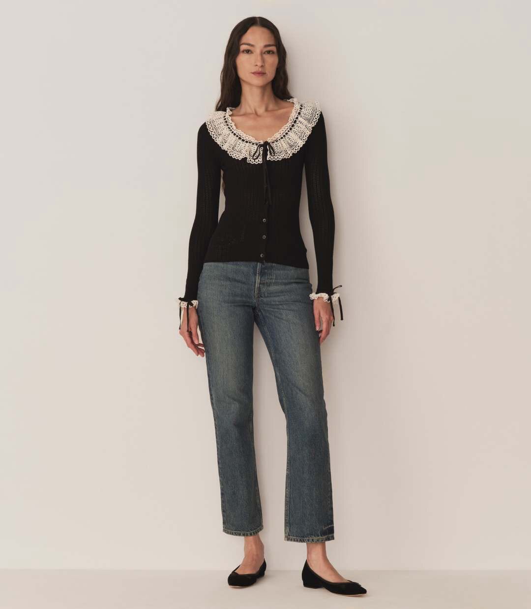 美系doe超美蕾丝钩织花边撞色领口镂空针织修身 复古上衣 甜美开衫