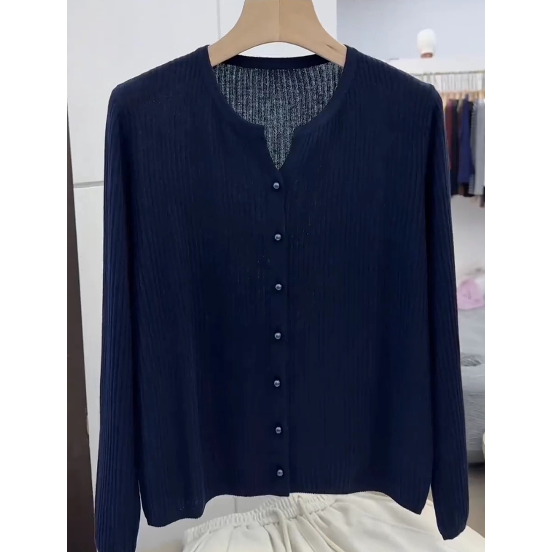 新品 3426 金豆藏青剪刀领开衫 秋季 百搭女士上衣 抽条针织衫