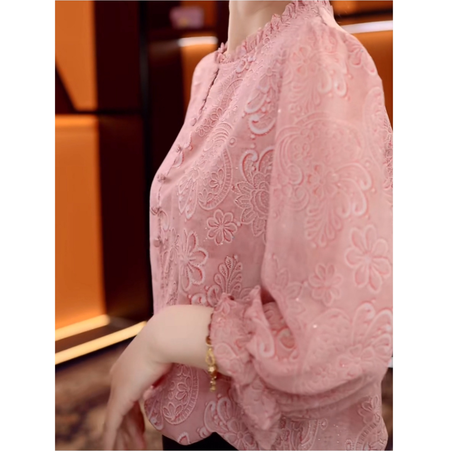 雪纺衫 2026春季 时尚 长袖 显瘦百搭网纱蕾丝小立领打底上衣潮 女修身
