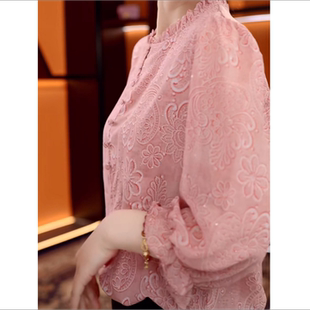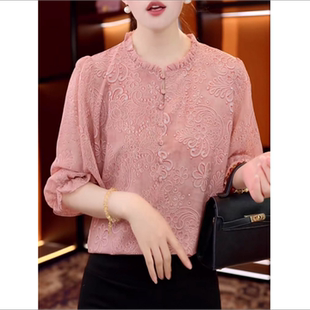 气质花边领粉色七分袖 女上衣春夏气质显瘦小衫 宽松印花妈妈装 衬衫由