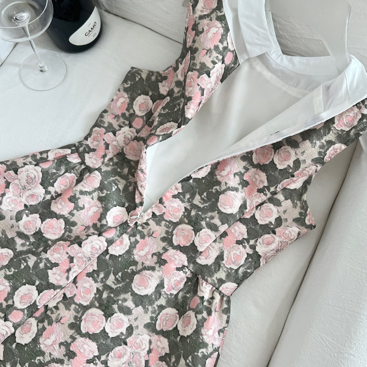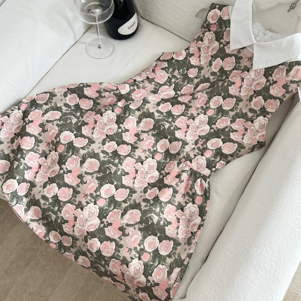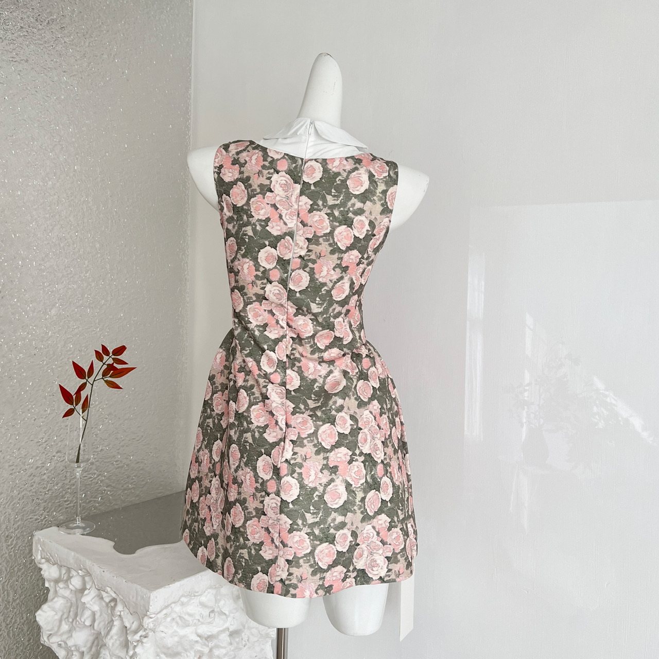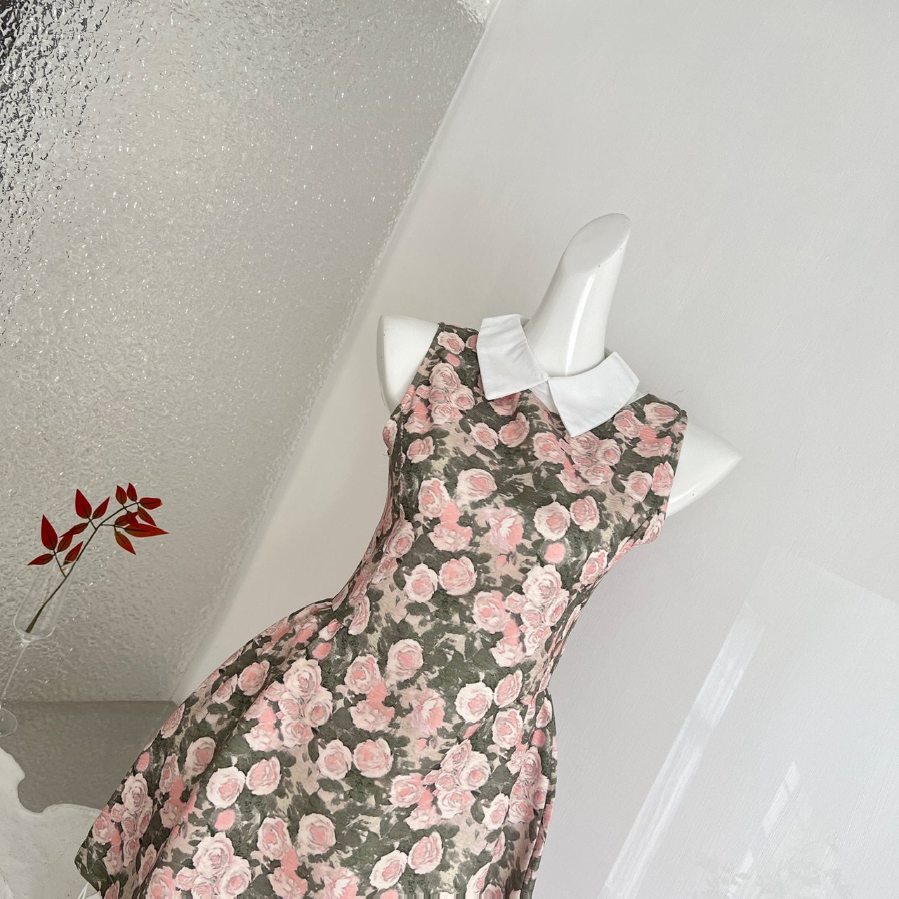 RECIT 领无袖 连衣裙女春夏千金风蓬蓬修身 收腰背心裙 玫瑰油画衬衫
