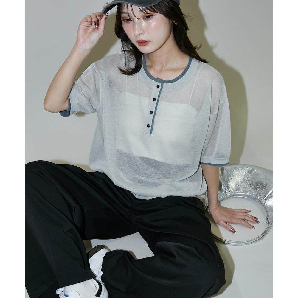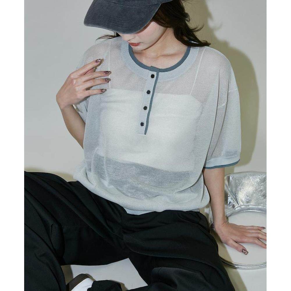 日本直邮官方授权 亚麻 拼色亨利领 针织上衣 PUBLUX由