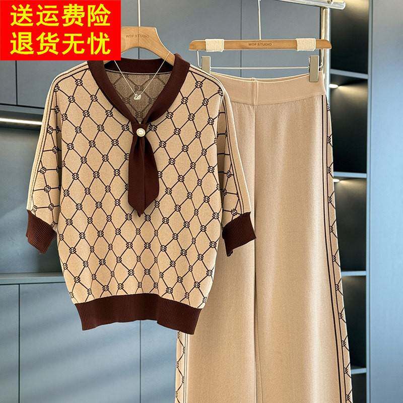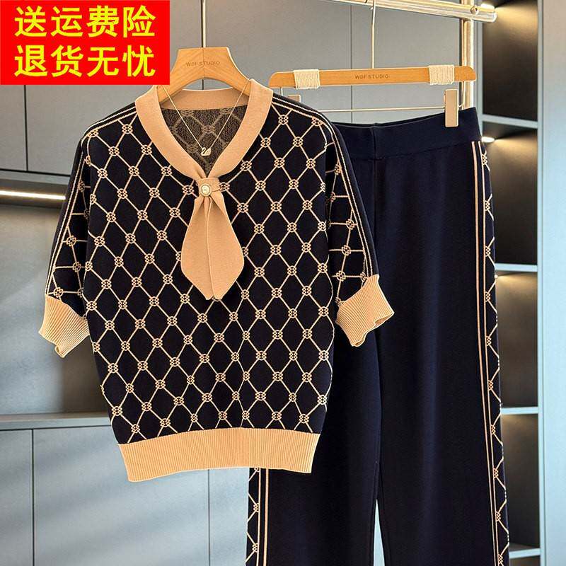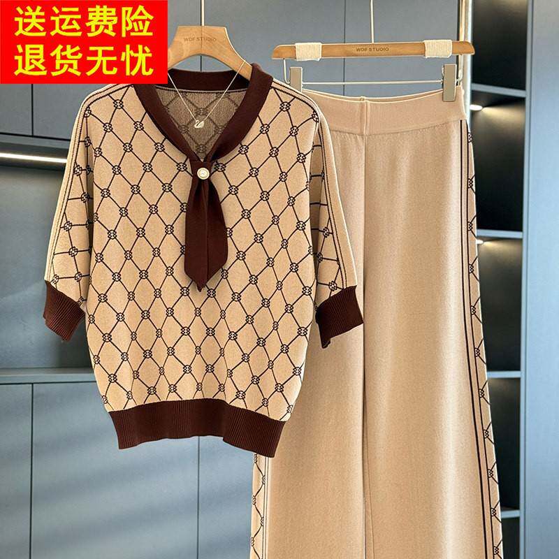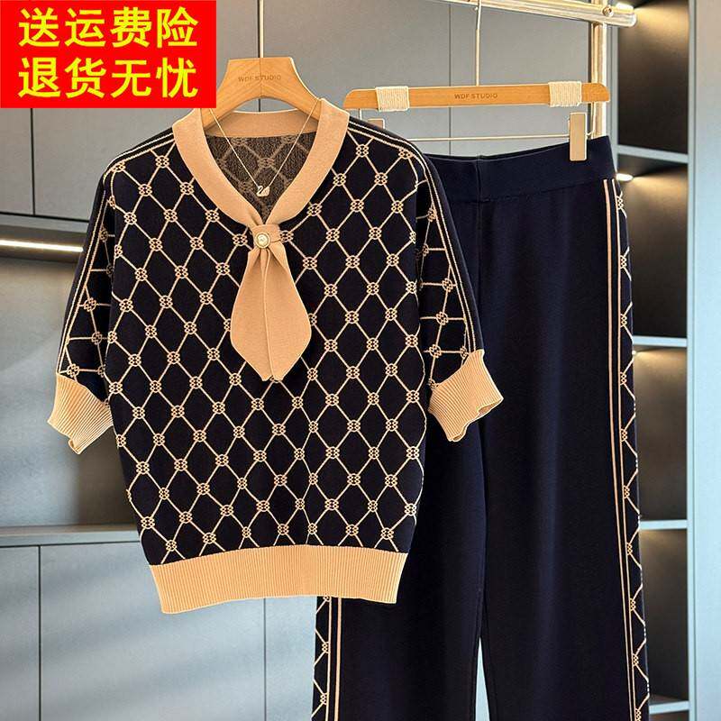 气质百搭妈妈装 时尚 针织两件套 新款 秋装 洋气中老年冰丝套装 女短袖