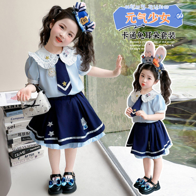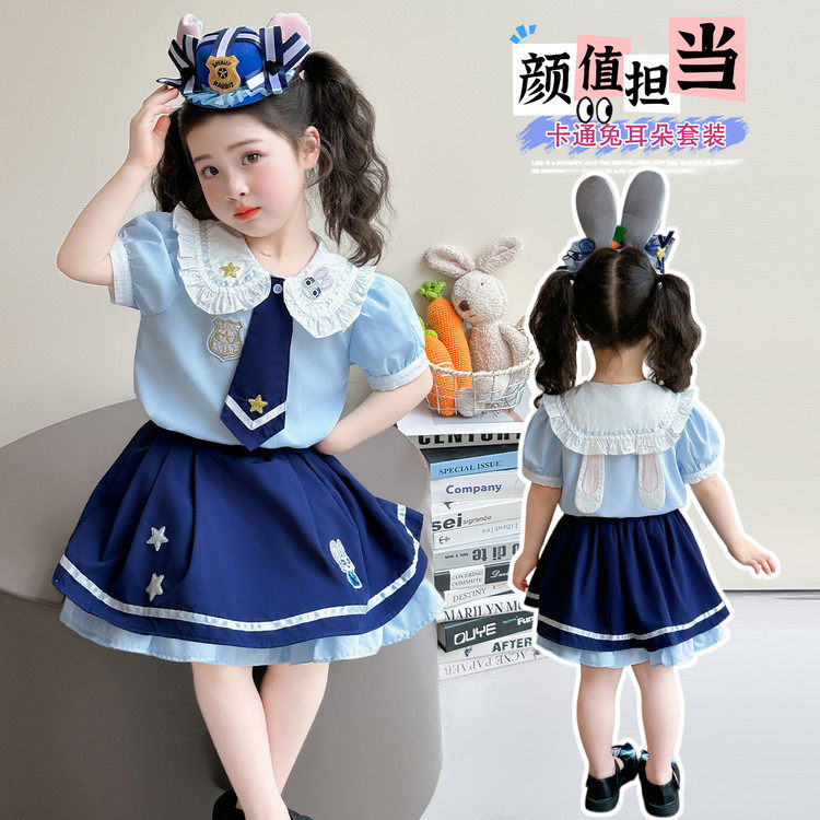洋气兔子警官衣服儿童女宝宝学院风jk裙子夏装 两件套 套装 女童夏季