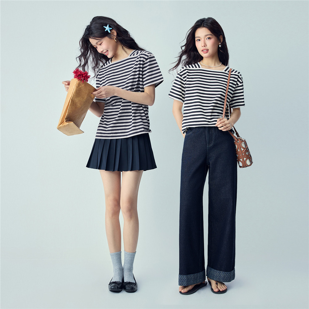 纯棉航海系撞色条纹方领短袖 T恤女05326464 新款 佐丹奴2026年夏季由