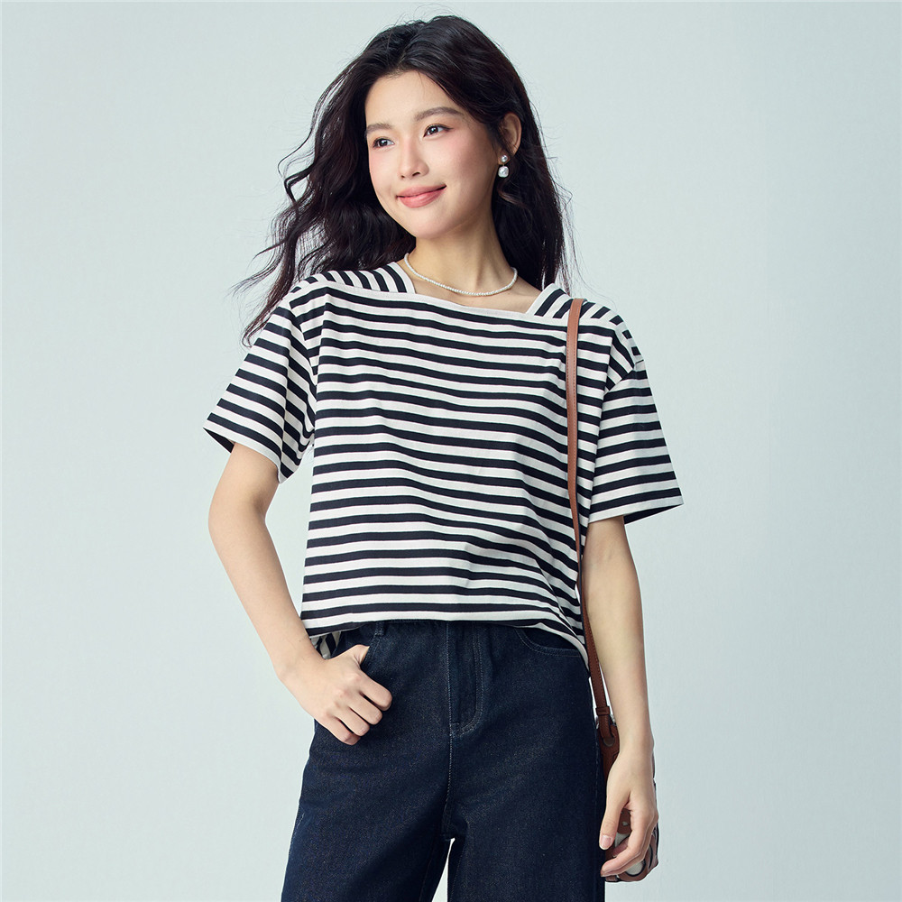 纯棉航海系撞色条纹方领短袖 T恤女05326464 新款 佐丹奴2026年夏季