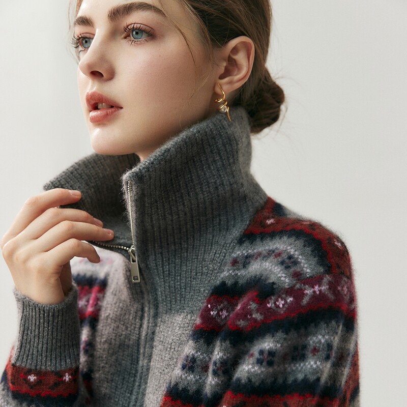 为您提供商品重磅加厚费尔岛山羊绒衫 女高领拉链提花针织毛衣松弛感宽松羊毛衫的详细介绍,