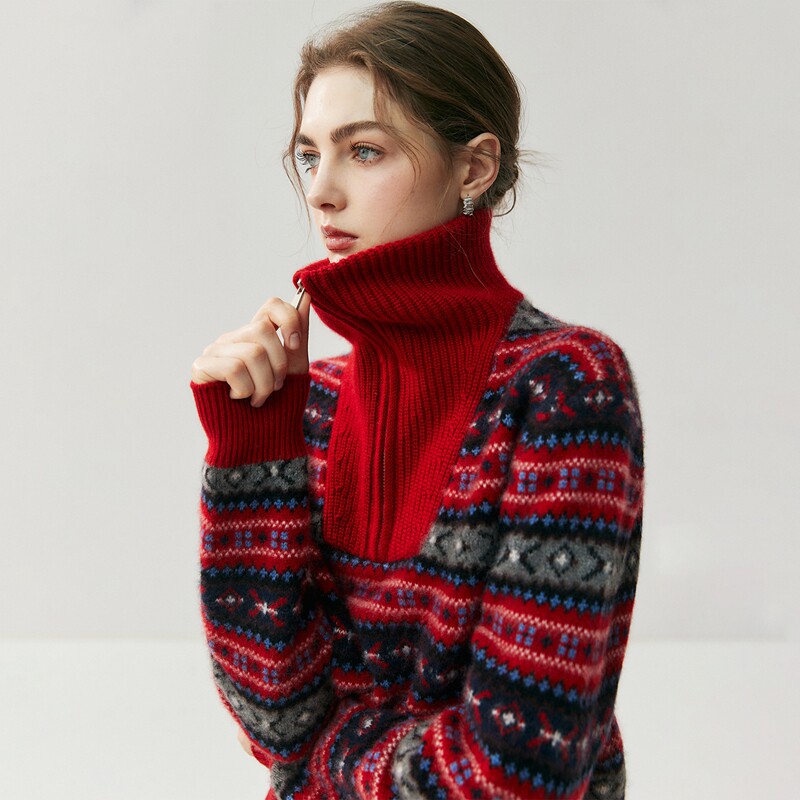 重磅加厚费尔岛山羊绒衫 女高领拉链提花针织毛衣松弛感宽松羊毛衫