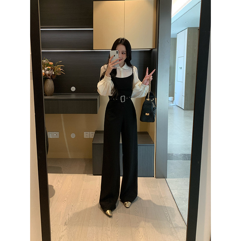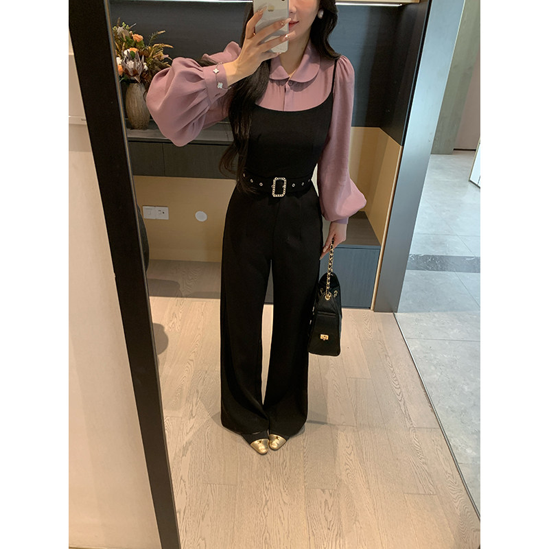 娃娃领天丝衬衫 春季 高知文学 女 连体裤 显瘦套装 吊带西装 XINYI