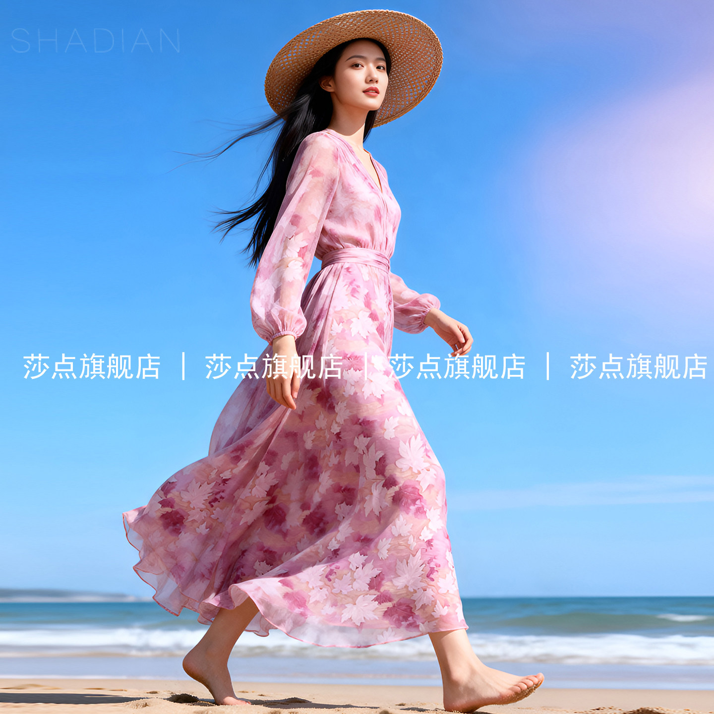 为您提供商品粉色长袖 气质大摆裙长裙海边度假沙滩裙 雪纺碎花连衣裙女2026新款的详细介绍,