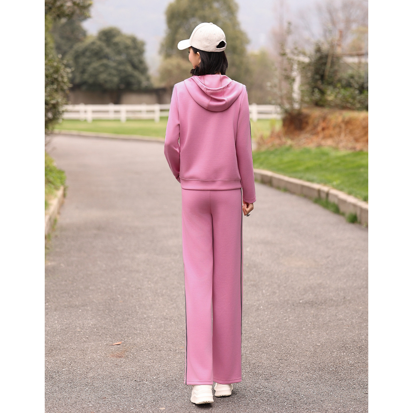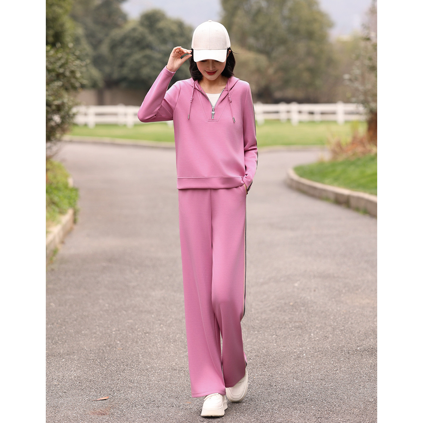 女2026春季 两件套 套装 枫竺烫钻侧条纹半拉链连帽空气层卫衣卫裤由
