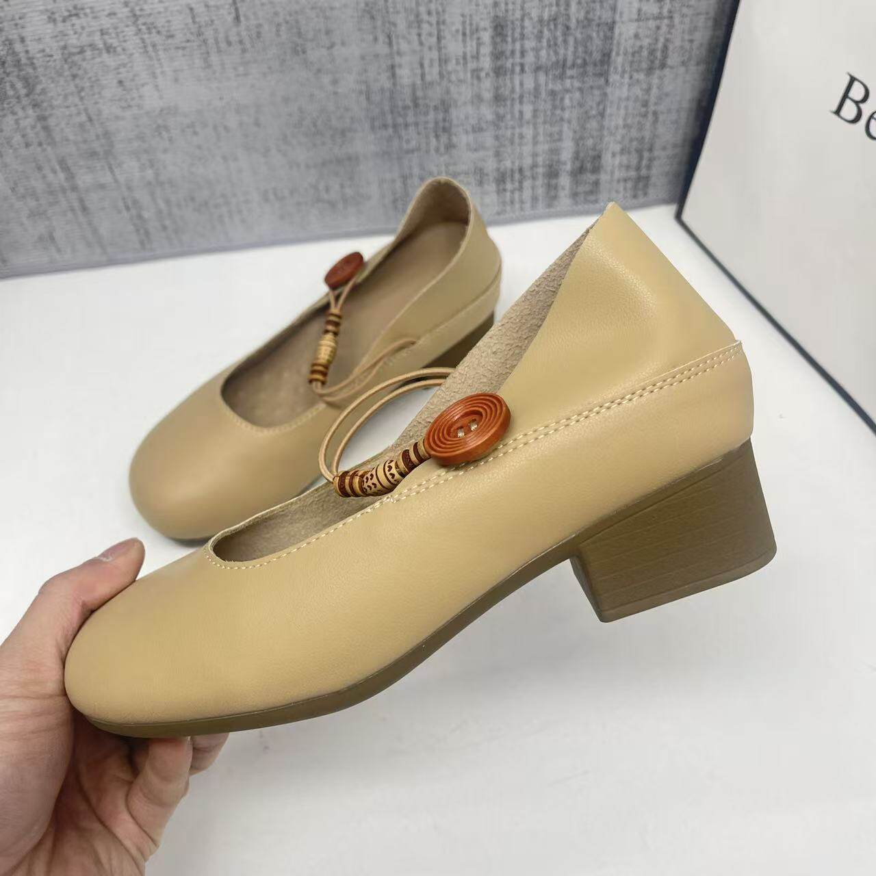 一脚蹬婚鞋 真皮 骄屿气质尖头粗跟玛丽珍法式 浅口单鞋 裸色高跟鞋
