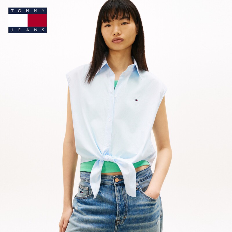 英同款 Tommy26春夏女纯棉府绸系结条纹落肩宽松无袖 衬衫 张元由