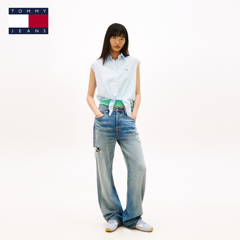 英同款 Tommy26春夏女纯棉府绸系结条纹落肩宽松无袖 衬衫 张元