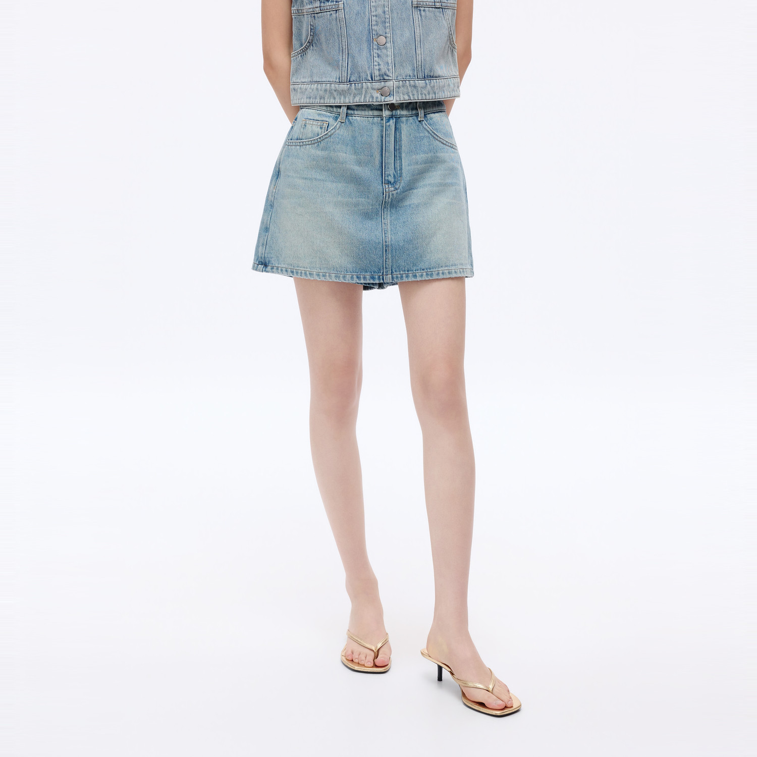 简约2026年夏季 朗姿 LIME莱茵棉质高腰牛仔假两件A字短裤 时尚 新款由