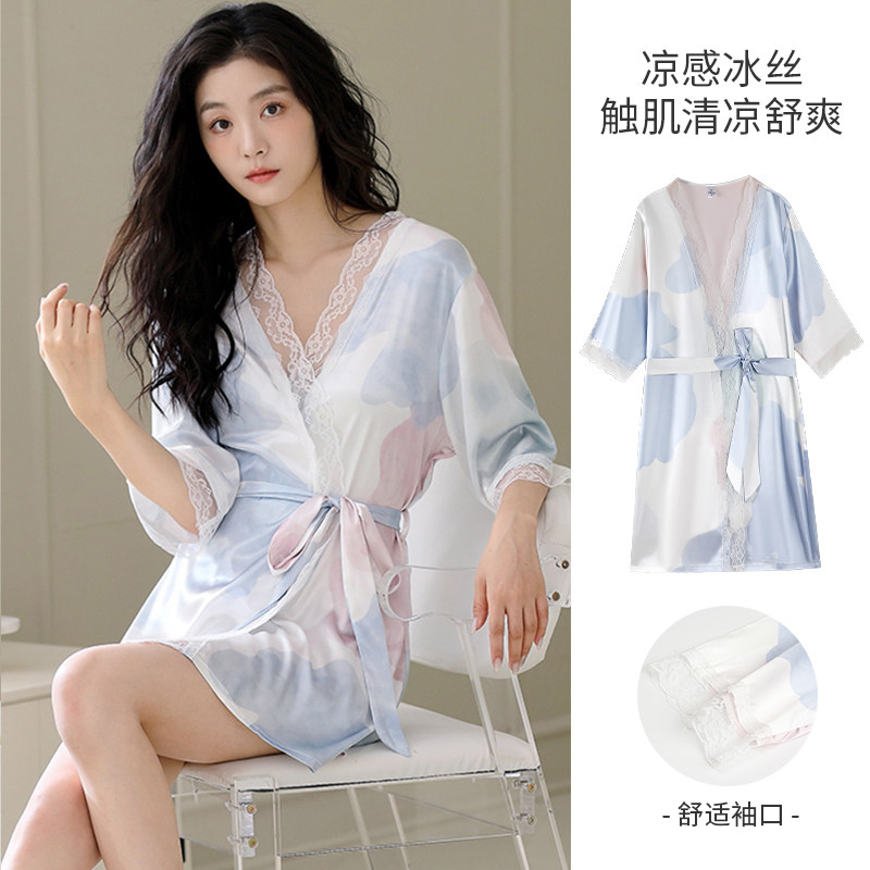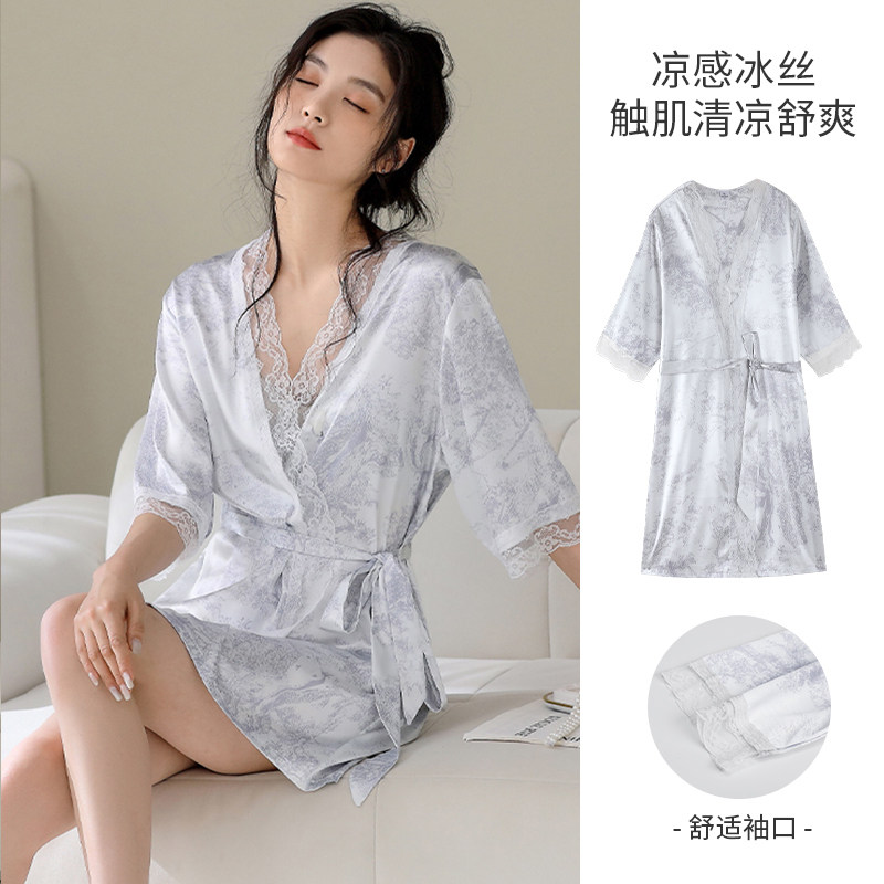 冰雪丝睡袍女夏季 系带性感高级凉感仿真丝绸蕾丝晨浴袍睡衣 七分袖由
