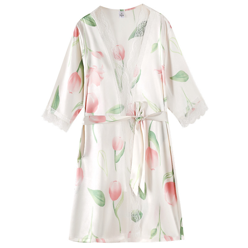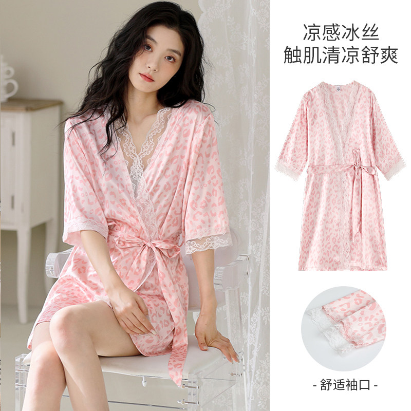 冰雪丝睡袍女夏季 系带性感高级凉感仿真丝绸蕾丝晨浴袍睡衣 七分袖