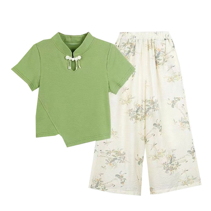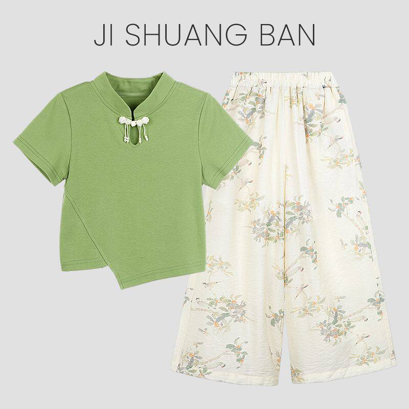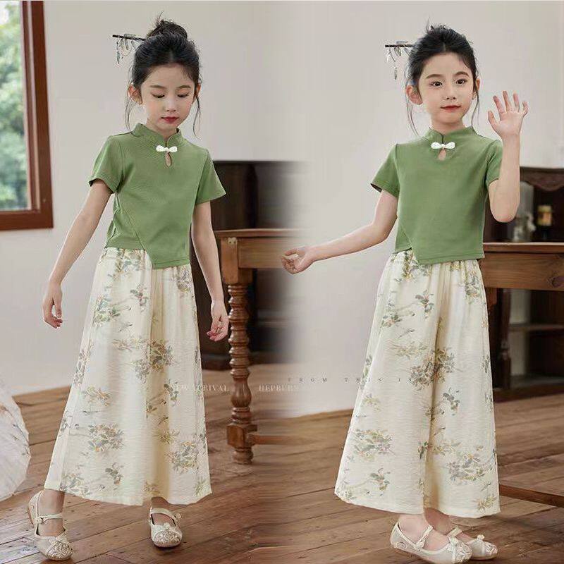 时髦新中式 2026新款 夏季 两件套 洋气防蚊裤 碎花短袖 阔腿裤 女童套装