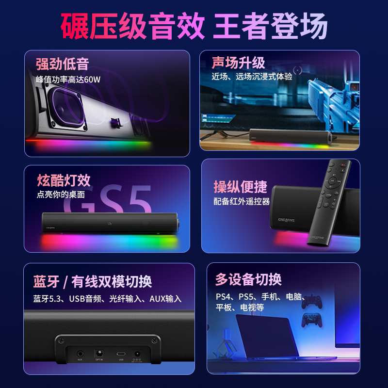 创新GS5电脑音响 家用游戏电竞桌面有线蓝牙一体插电长条音箱 台式由