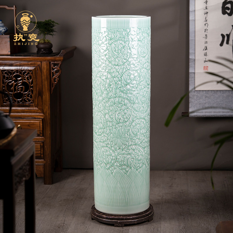 饰品瓷瓶摆件 景德镇陶瓷器落地大花瓶手工雕刻青瓷箭筒客厅公司装由