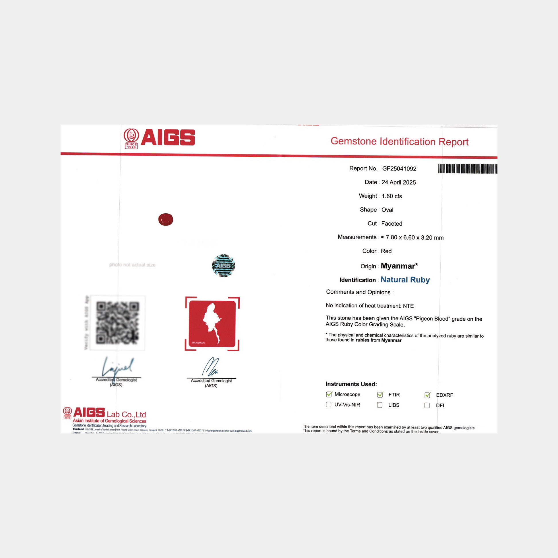 AIGS天然缅甸无烧鸽血红红宝1.60克拉裸石戒面拍卖级红宝石