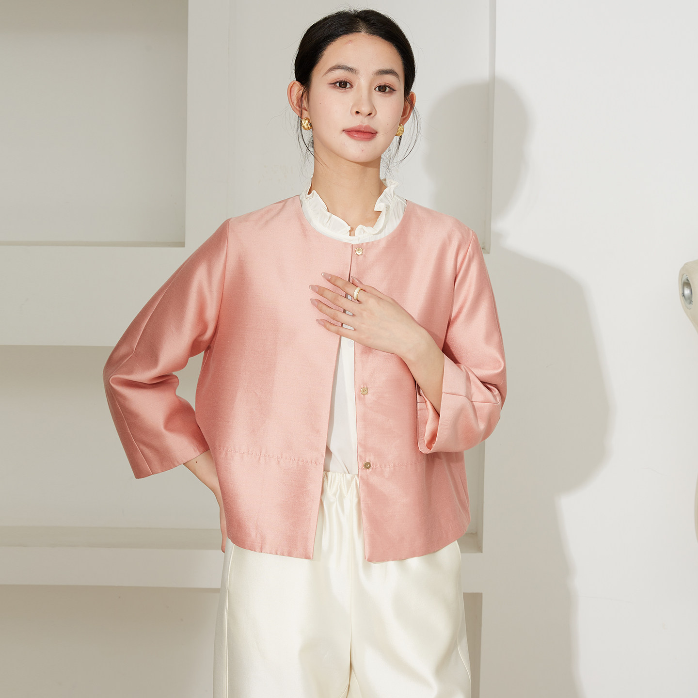 短外套开衫 春 极简通勤气质丝毛外套女桑蚕丝羊毛无领短款 一丝牵