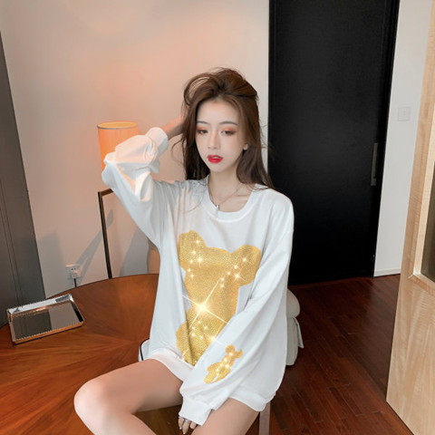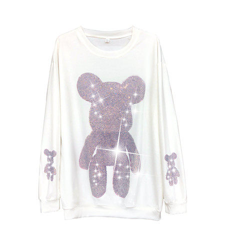 棉2021新款 T恤女潮牌烫钻小熊卫衣学生宽松下衣失踪上衣ins潮 韩版