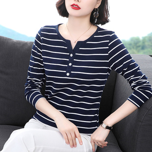 为您提供商品2026新款 纯棉长袖 t恤女v领上衣中老年女装 妈妈春季 条纹内搭打底衫的详细介绍,