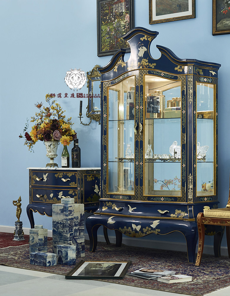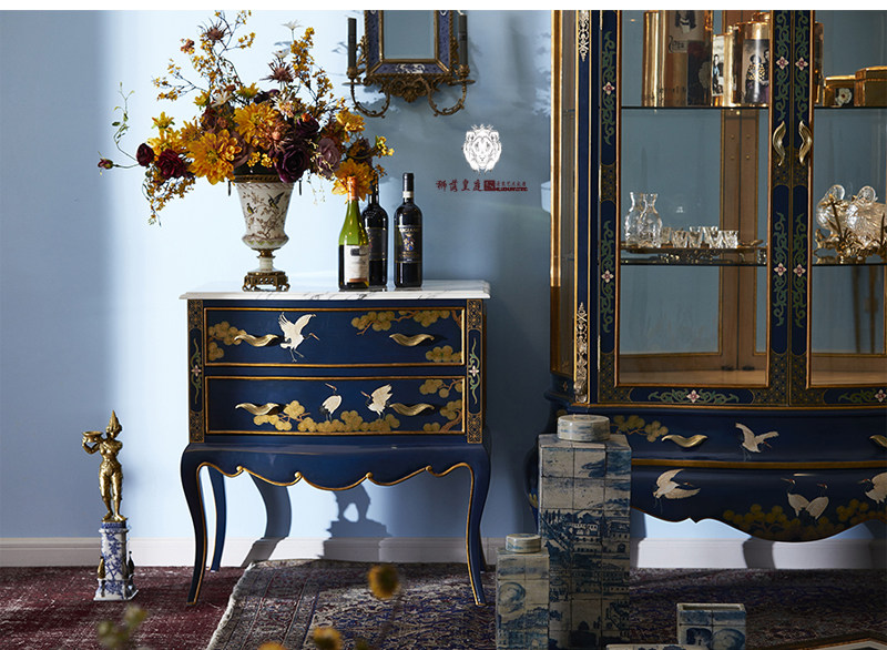 混搭进口实木床头柜纯手工艺术彩绘松鹤玄关柜 狮落豪庭高端新中式由