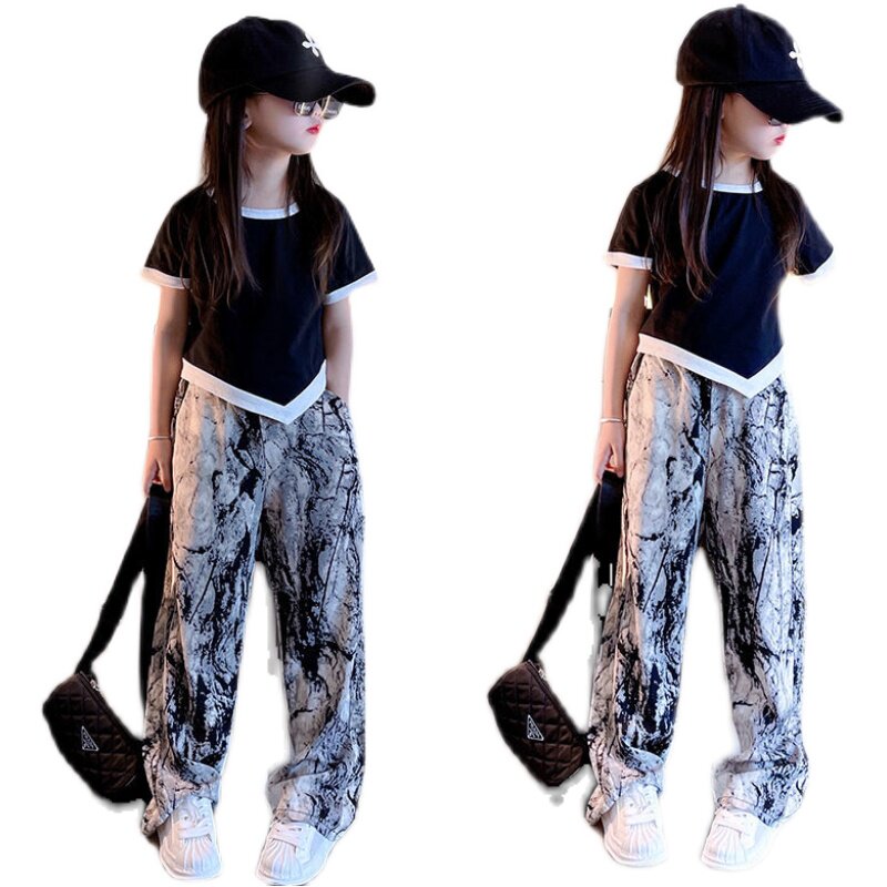 时髦洋气儿童阔腿裤 女童夏装 中大童设计感短款 不规则短袖 两件套装