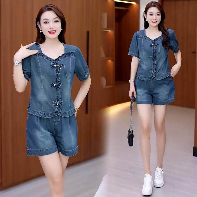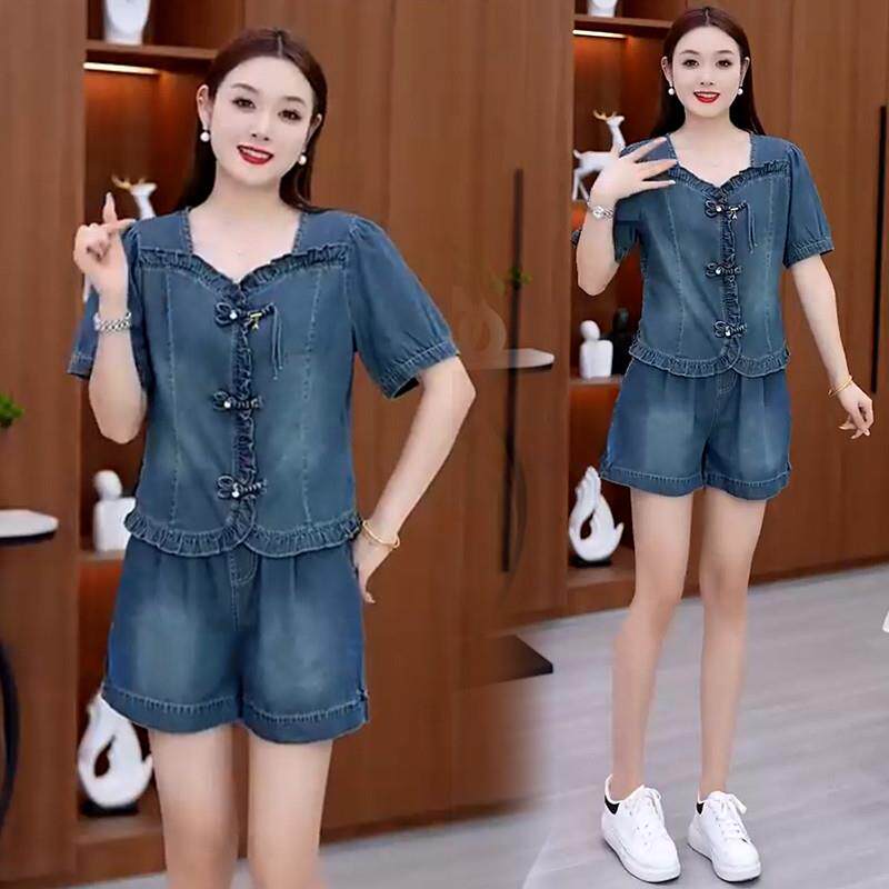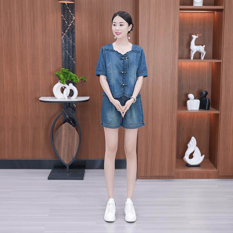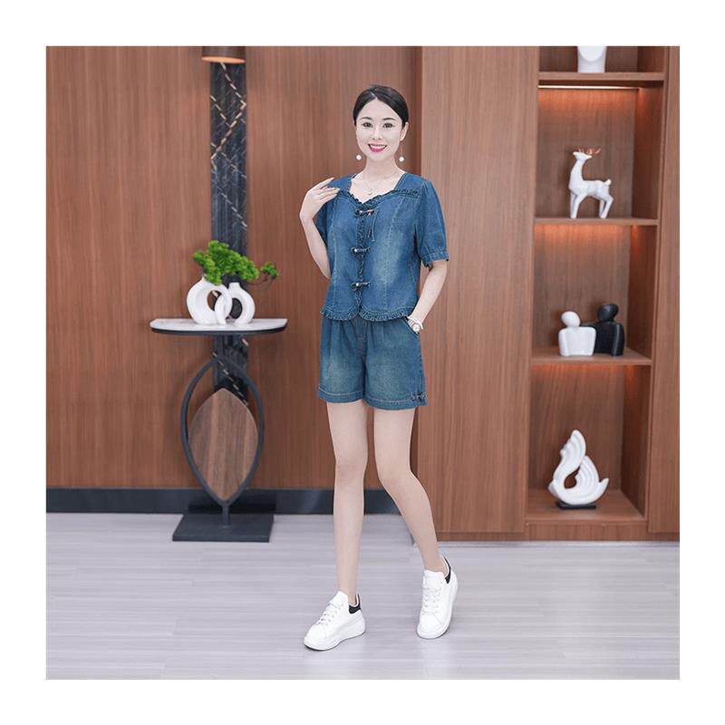 新款 两件套潮 新中式 女夏季 洋气盘扣短袖 阔腿短裤 时尚 牛仔套装 薄款由