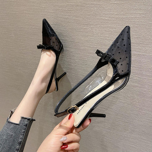 透气凉鞋 波点网纱高跟鞋 女细跟蝴蝶结中跟后空尖头单鞋 2026年新款由