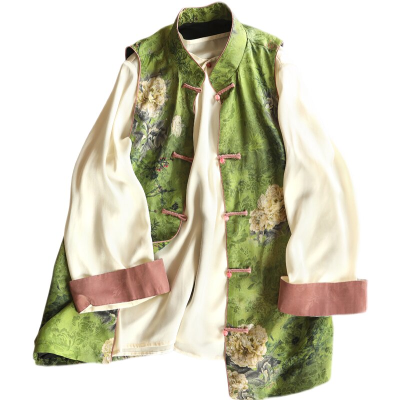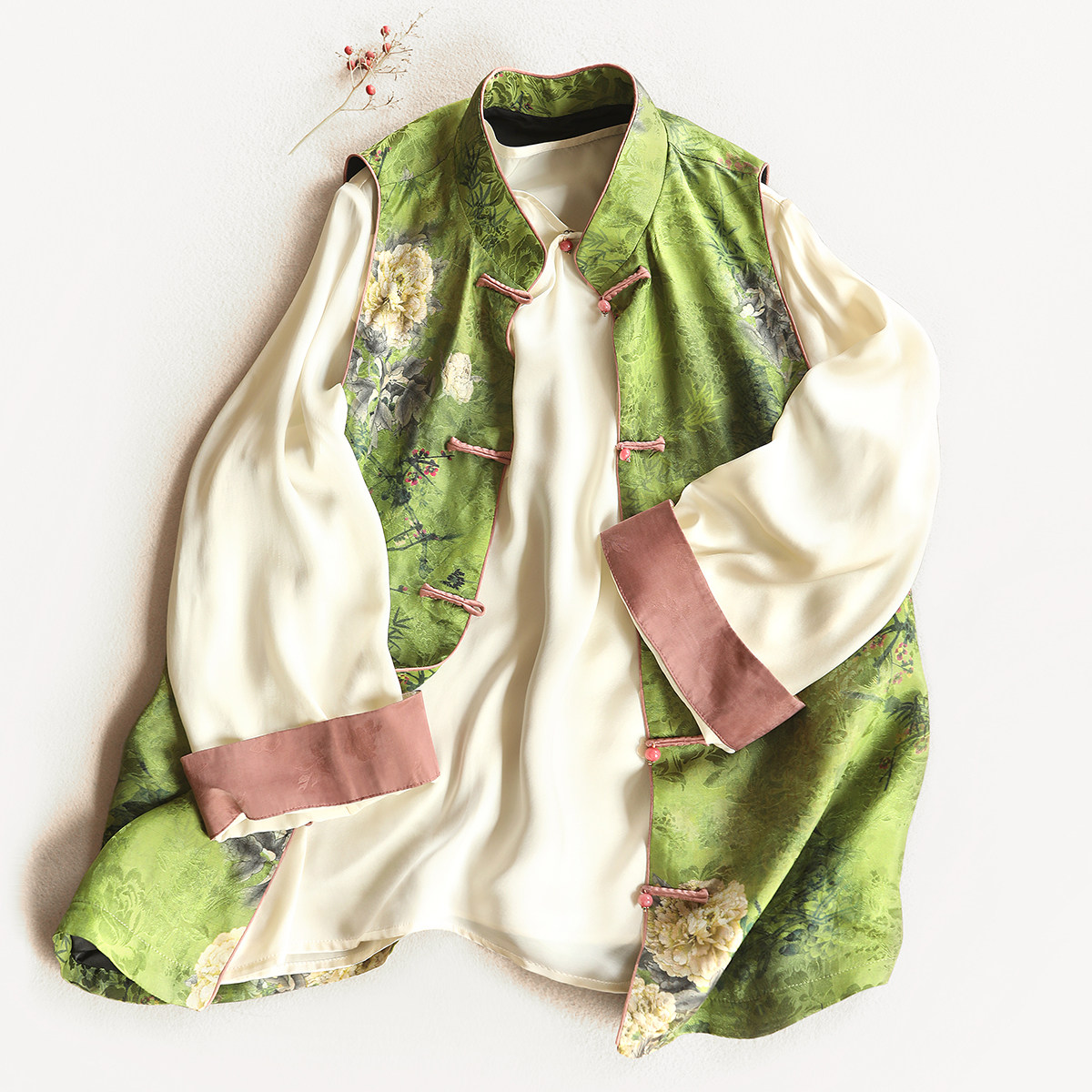 云澍原创 上衣时尚 中式 T恤两件套 交织香云纱印花马甲真丝宽松长袖由