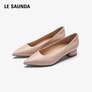 莱尔斯丹春夏新款 女35507 舒适通勤尖头百搭黑色真皮浅口粗跟单鞋