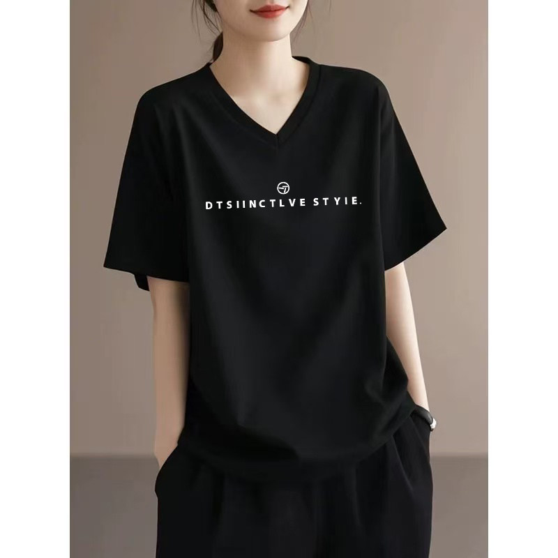 宽松显瘦打底衫 黑色纯棉V领短袖 上衣 百搭大码 新款 t恤女装 2026夏季