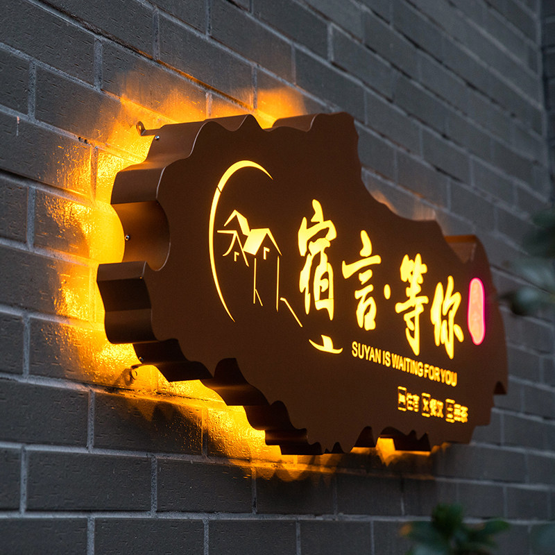 民宿创意复古发光灯箱广告牌门头招牌Logo墙展示牌铁艺镂空门牌