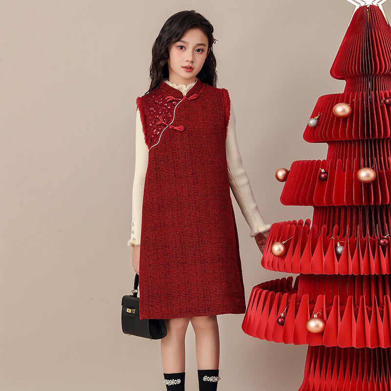 女童加绒两件套装 旗袍裙子秋冬款 背心连衣裙套装 高级感国风改良版