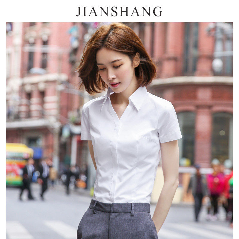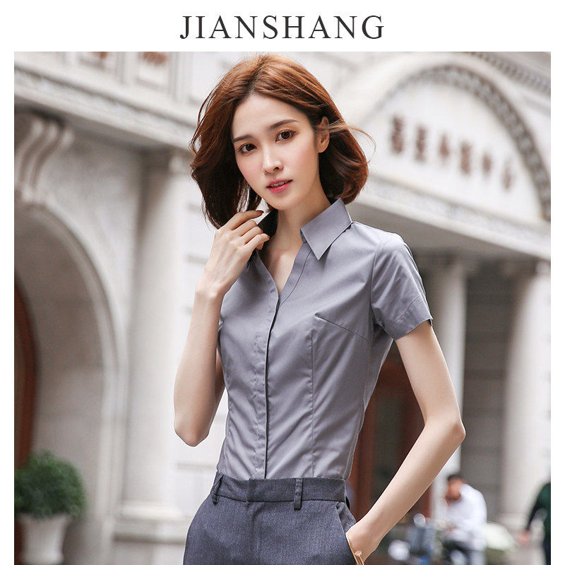 为您提供商品上班正装 职业白色衬衫 女短袖 2025夏季 V领面试前台工作服蓝色衬衫的详细介绍,