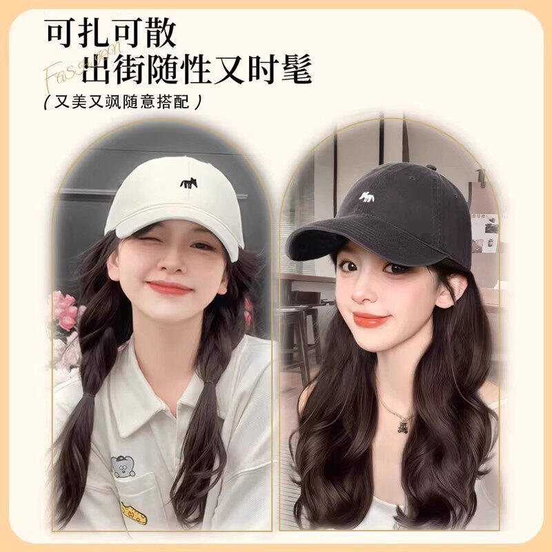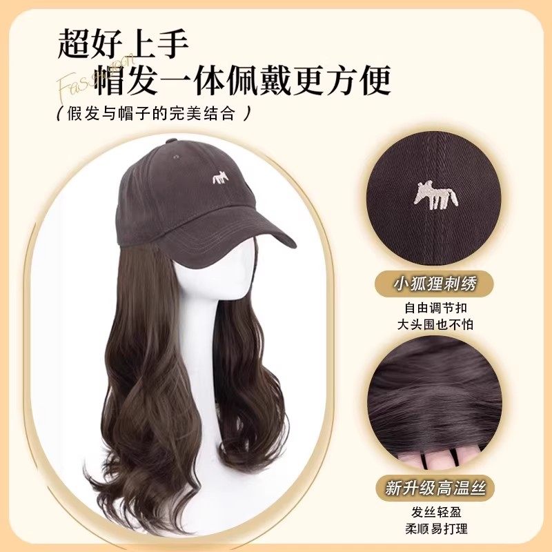 帽子假发一体女长卷发秋冬新款 小狐狸刺绣棒球帽子带假头发套 时尚由