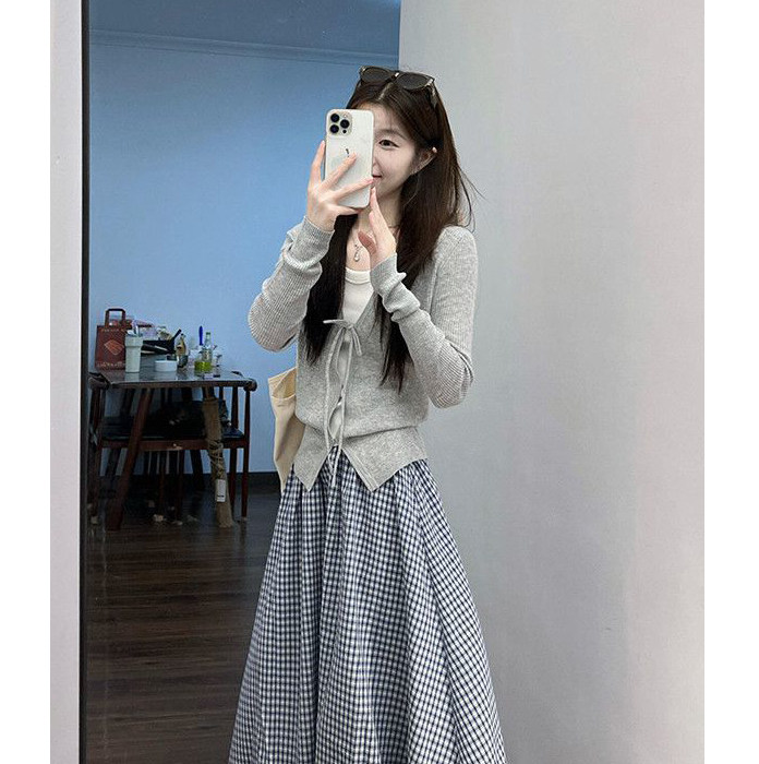 早秋季 针织开衫 女搭配格纹高腰半身裙两件套装 韩系通勤风灰色长袖