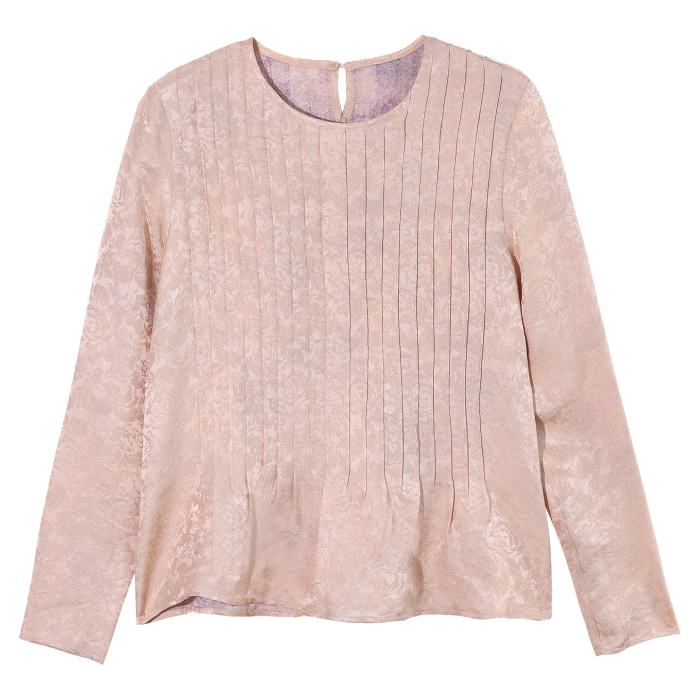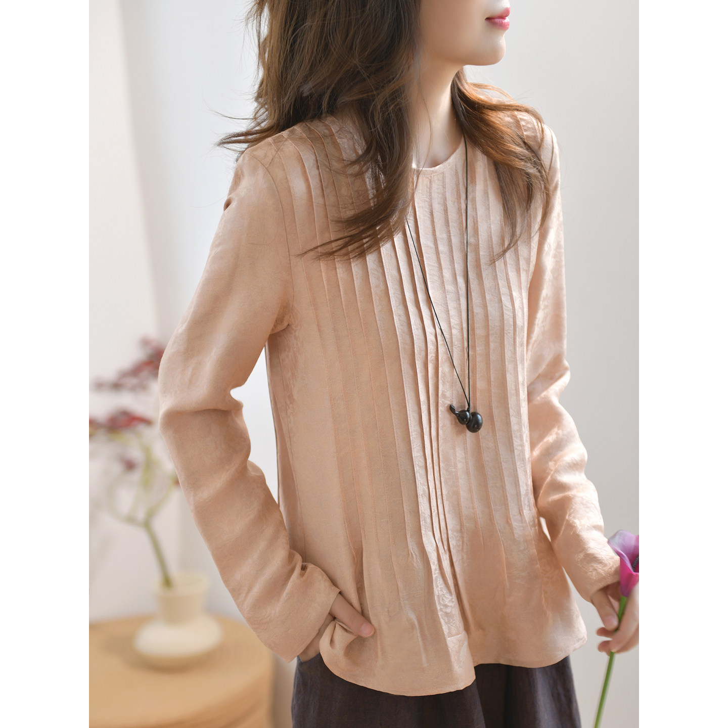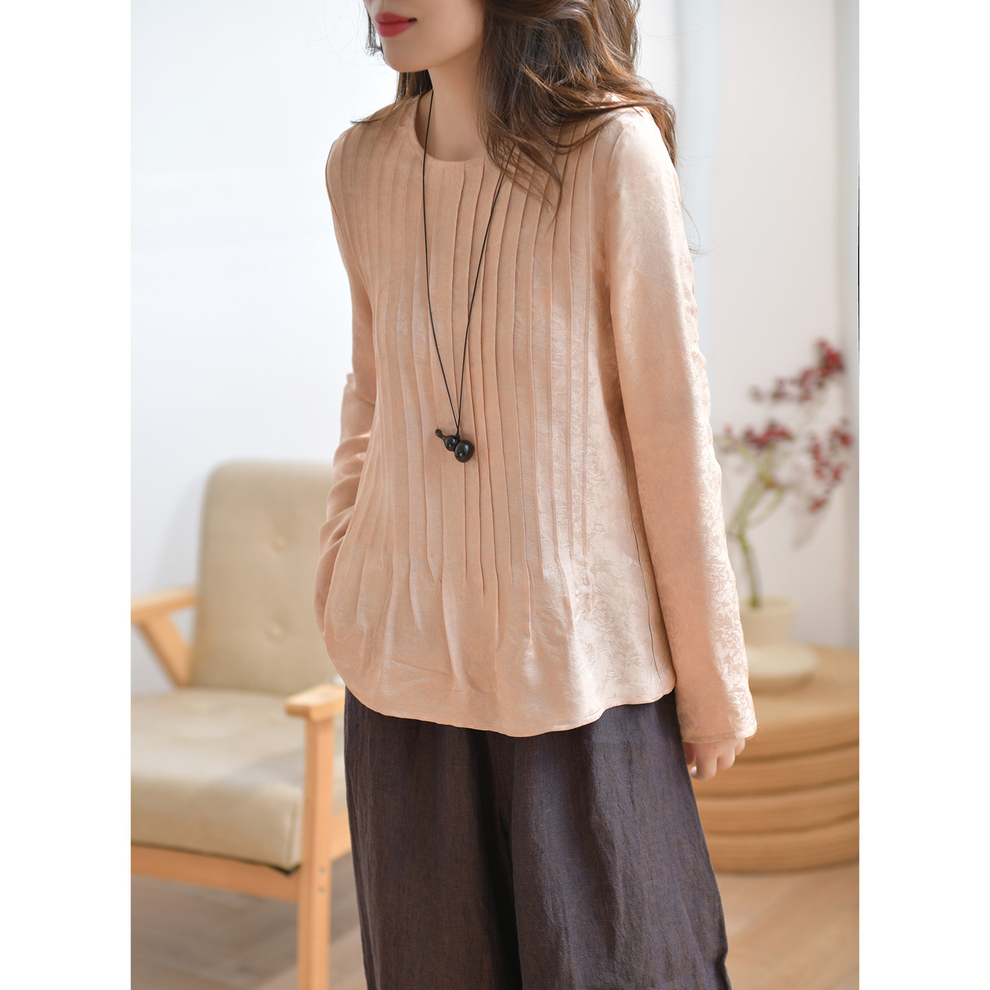 GESGOO原创设计风琴褶提花真丝衬衫 气质上衣早秋 女显瘦圆领娃娃衫