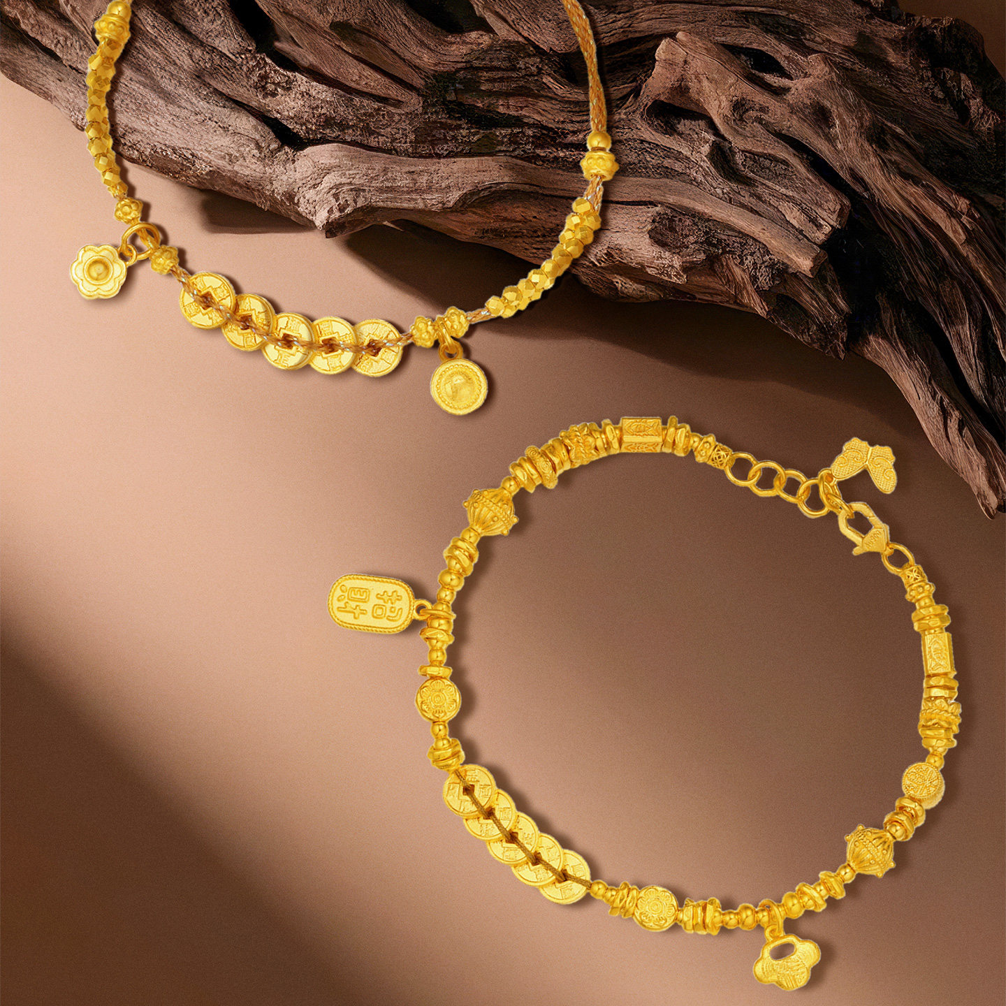 潮宏基臻金珍藏五帝钱币黄金手链足金古法蹦迪珠爆闪生日礼物卟由