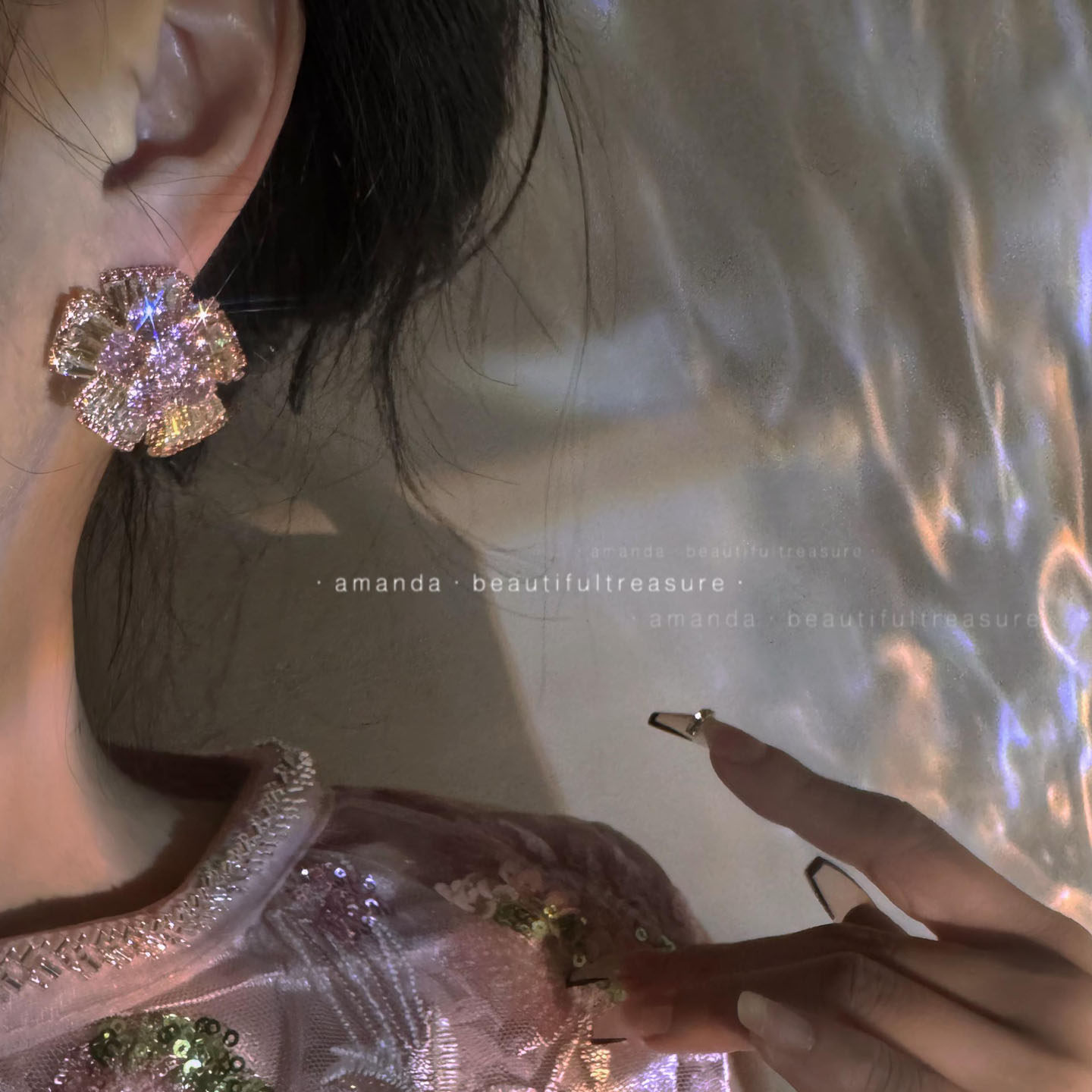 法式 宫廷耳环耳饰 复古轻奢夸张闪钻粉色花朵高级感气质耳钉女时尚