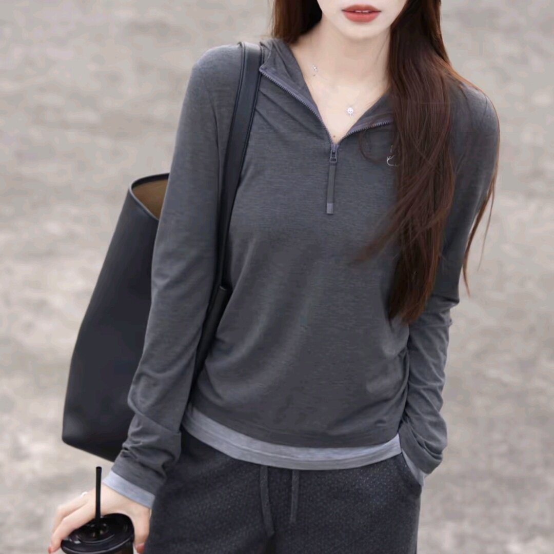 显瘦上衣纯色宽松卫衣绒衫 高档半开领长袖 假兜衬衫 气质大码 休闲装