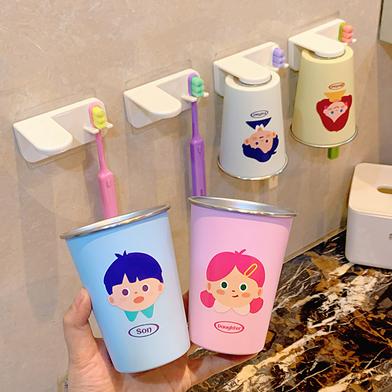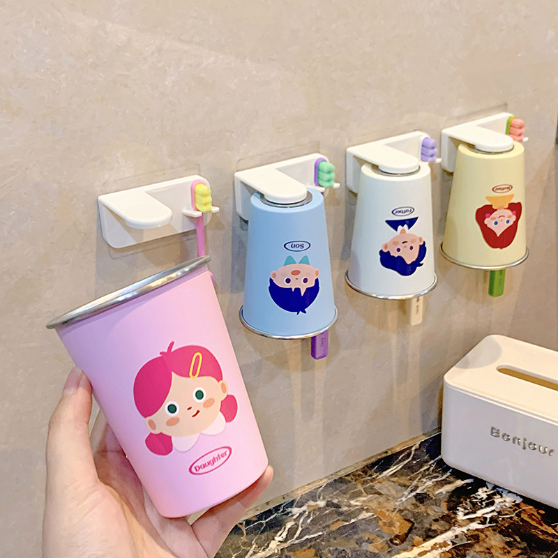 304倒挂磁吸架卡通一家四口洗漱高颜值情侣可爱牙刷不锈钢漱口杯